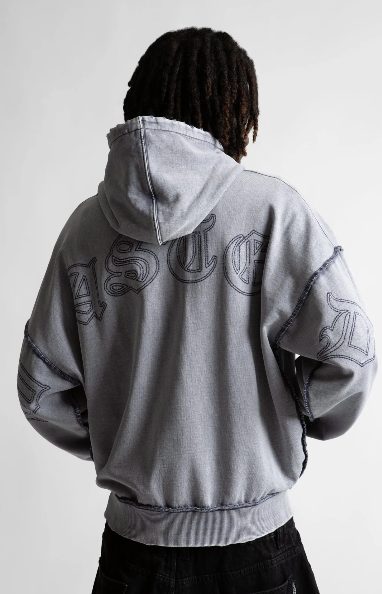 The Kingdom Curve Faded Hoodie is made from a thick 420gsm fleece. It features a faded effect, a destroyed effect, and turned seams. It features Kingdom Curve embroidery on the back.