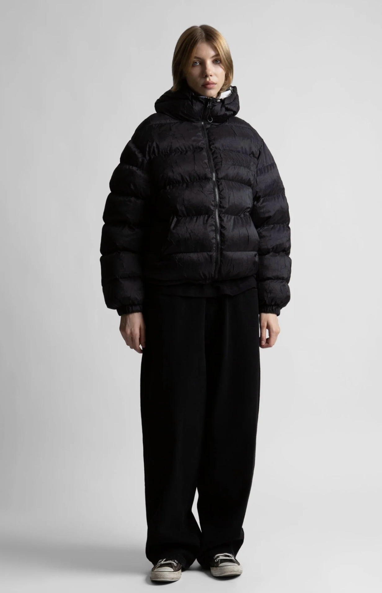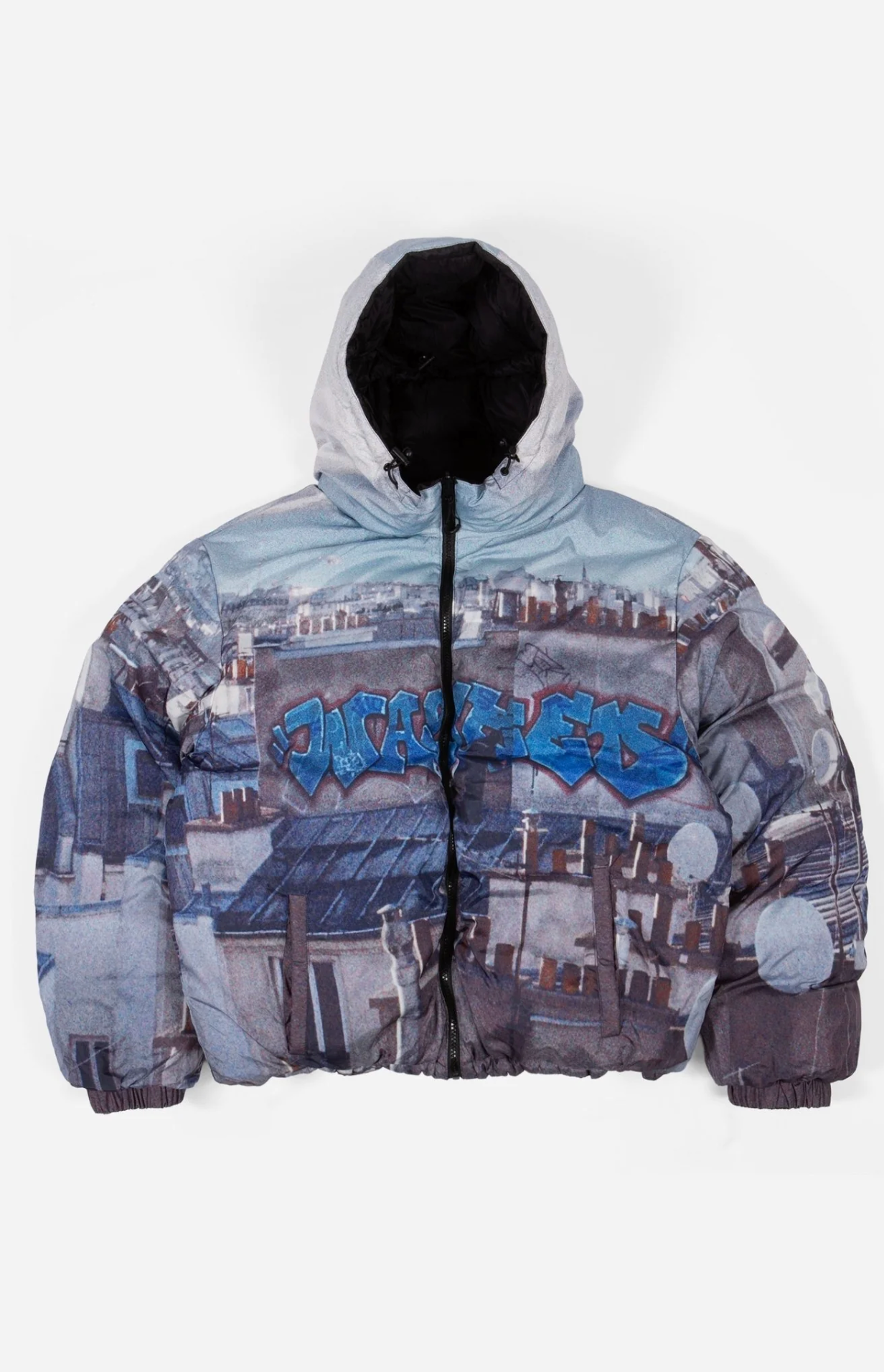Our Elevation Puffer is reversible: black on one side and printed on the other. A Wasted logo is printed on the heart. The puffer jacket features adjustable drawstrings at the waist and hood.