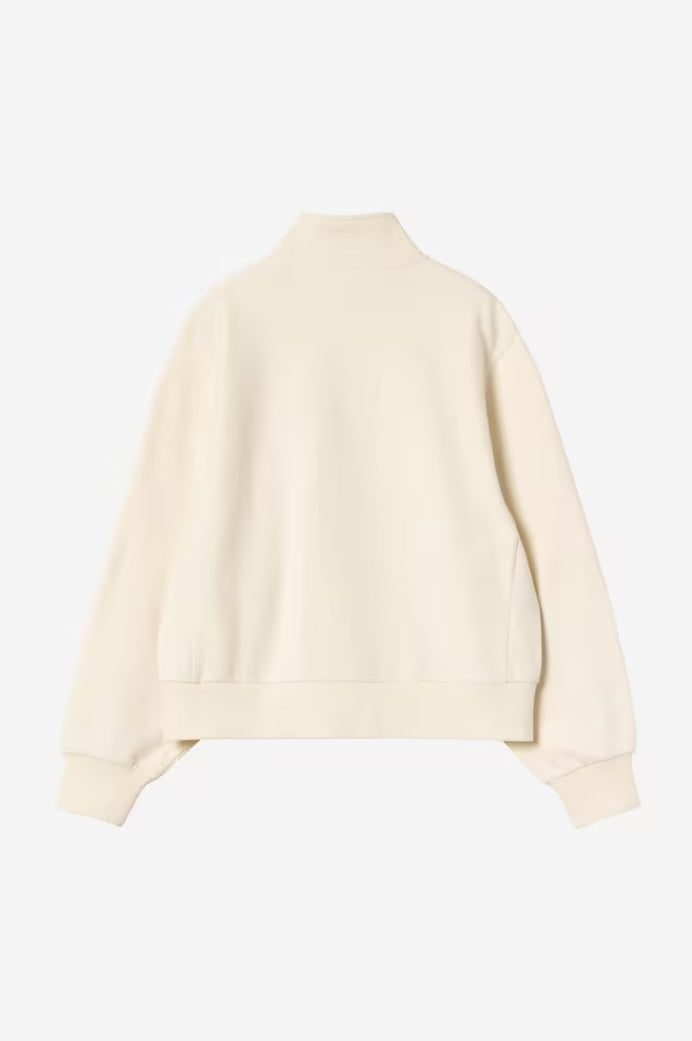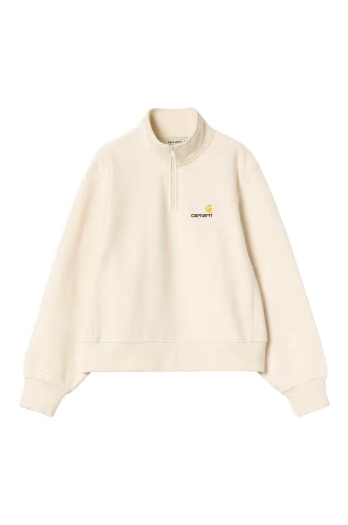 The Women's American Script High Neck Sweatshirt is made in a boxy fit from polycotton jersey with a brushed, fleece-like backing. The item has a high neck and zipped half placket. Two-tone American Script embroidery appears on the chest.