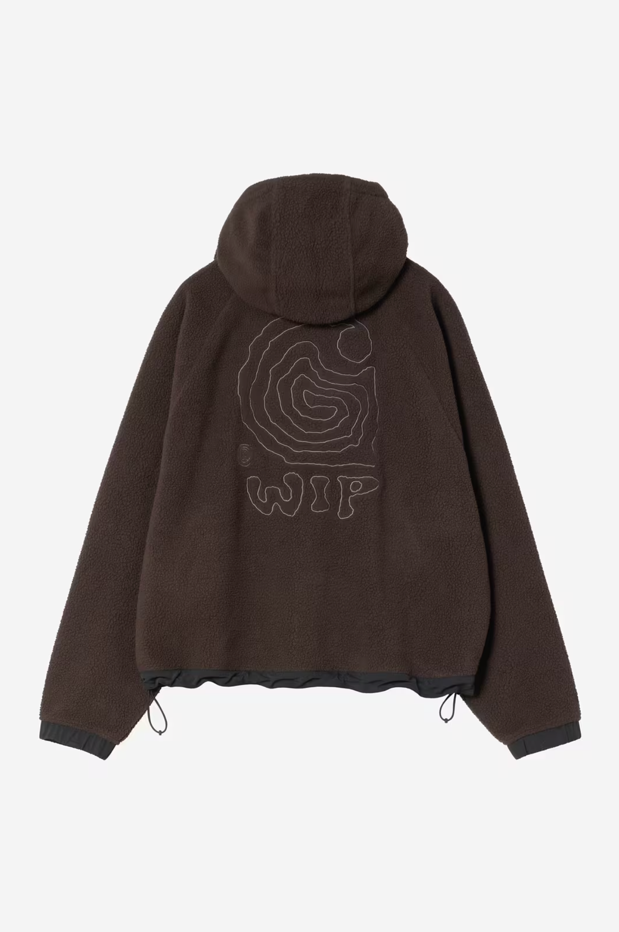 The Women's Hooded Helix Fleece Jacket is made in a boxy fit from a midweight polyester fleece, which has been brushed for a softer, tactile feel. The item also features a snorkel hood. Contrasting nylon trims appear on the cuffs and bottom band, which can also be adjusted. A large embroidered graphic appears at the back.