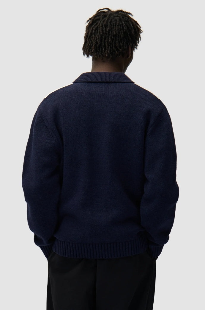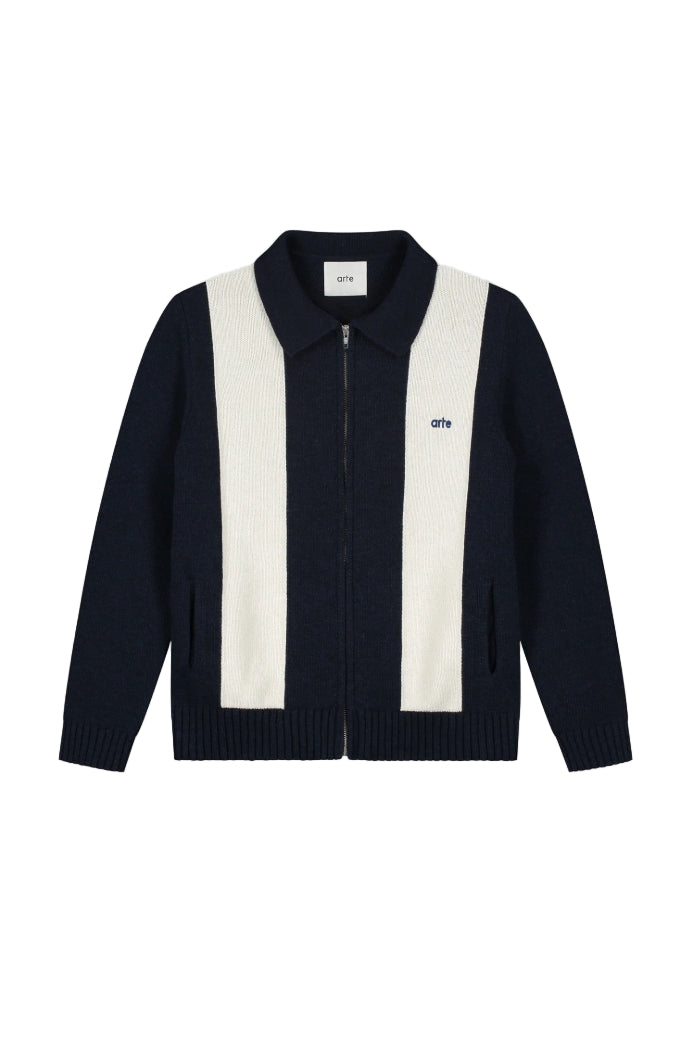 The Cardigan functions as a cozy extra layer that adds both style and comfort to your outfit. Made from premium wool blend, it features a striped design consisting of contrasting shades of navy and cream. Finished with a full length zipper in the front and a navy embroidery on the left chest.