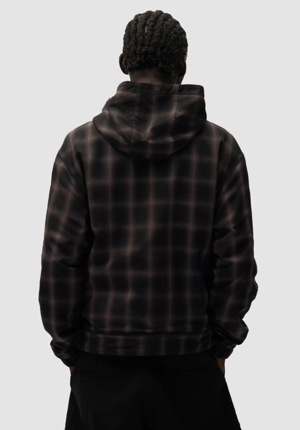 The jacket offers two distinct looks, one side is crafted from durable fleece, while the other showcases a plaid pattern. Both sides are detailed with side pockets, a full-length zipper, elasticated waistband and a hood.