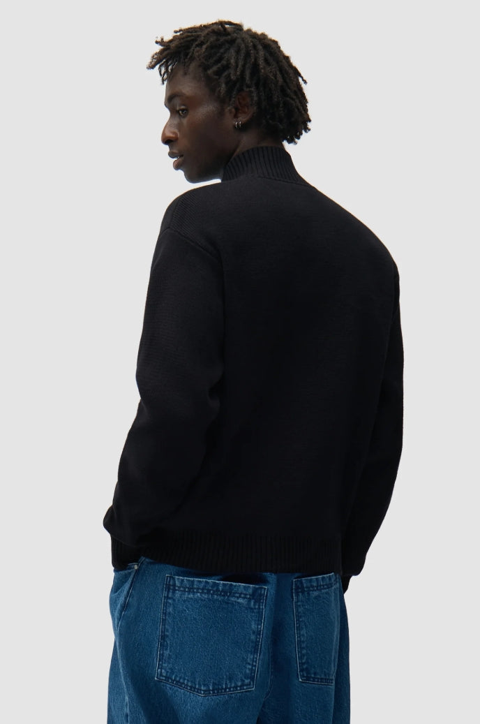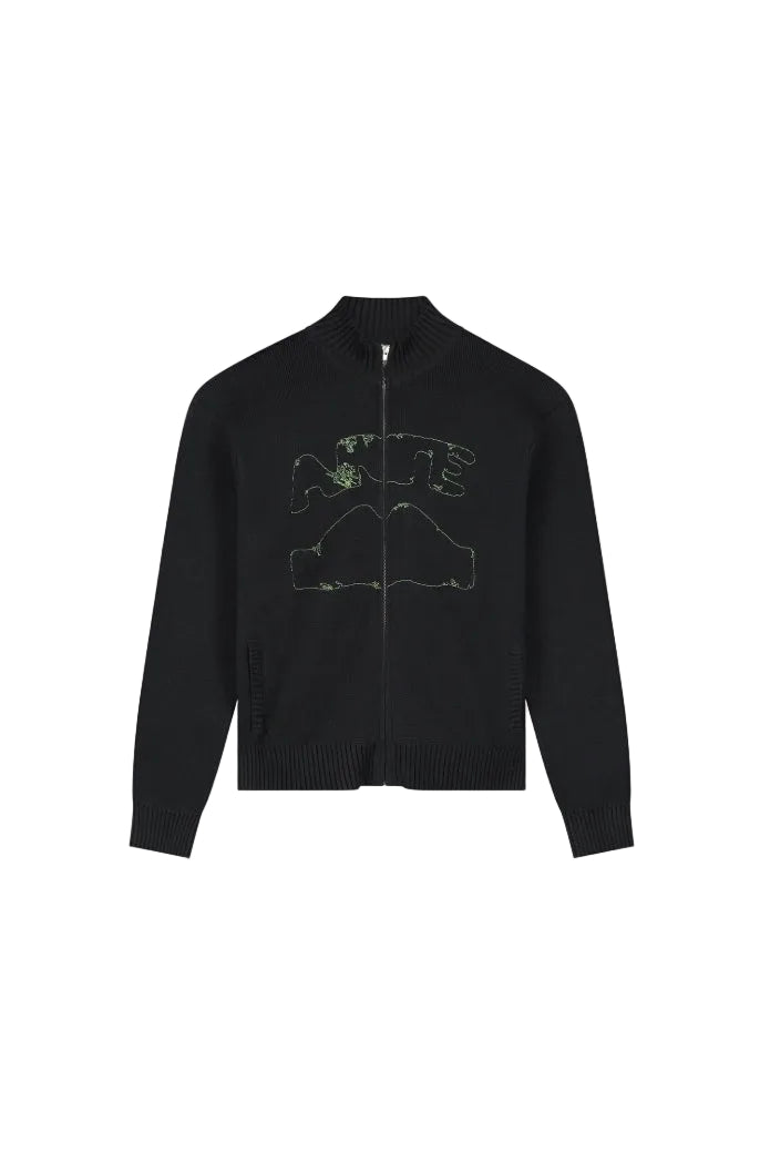 Crafted from premium cotton, the cardigan in olive green features the contrours of a community favorite graphic stitched slightly distorted across the chest in green. The knit is finished with two side pockets, ribbed trimmings and a full-length zipper.