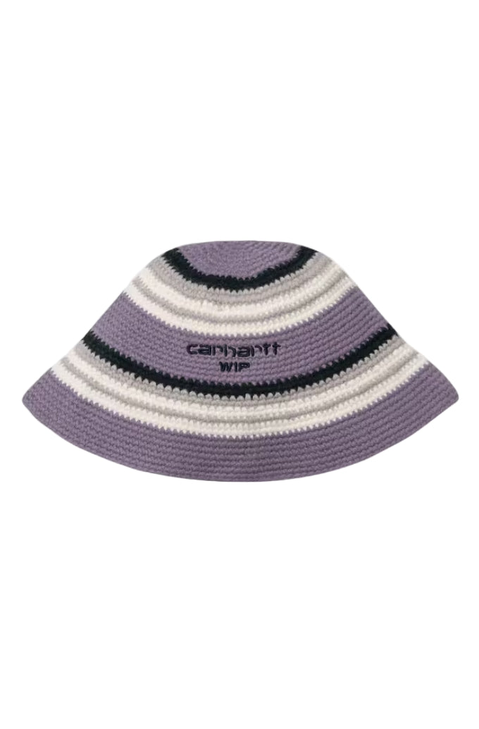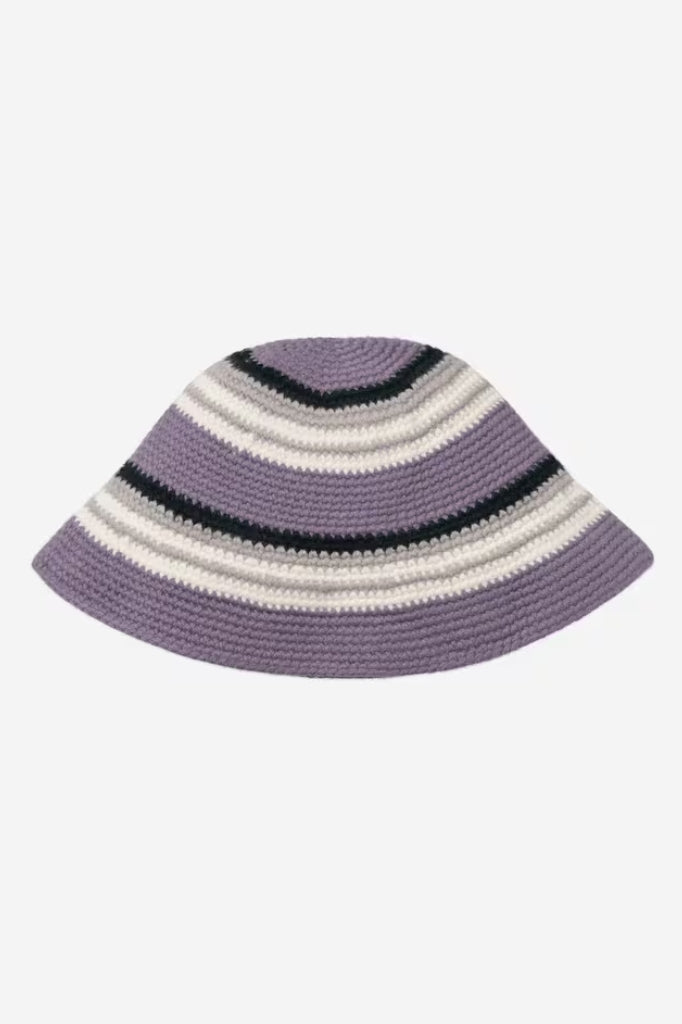 The Holm Hat is a crochet style made from wool featuring allover jacquard stripes. Embroidered lettering appears on the front.