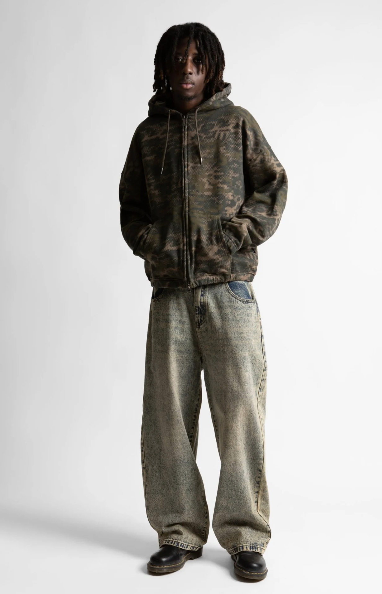 The Digicamo Boxy Zip Hoodie is made from a 430gsm cotton. It features a boxy cut and displays a screen-printed Digicamo pattern.