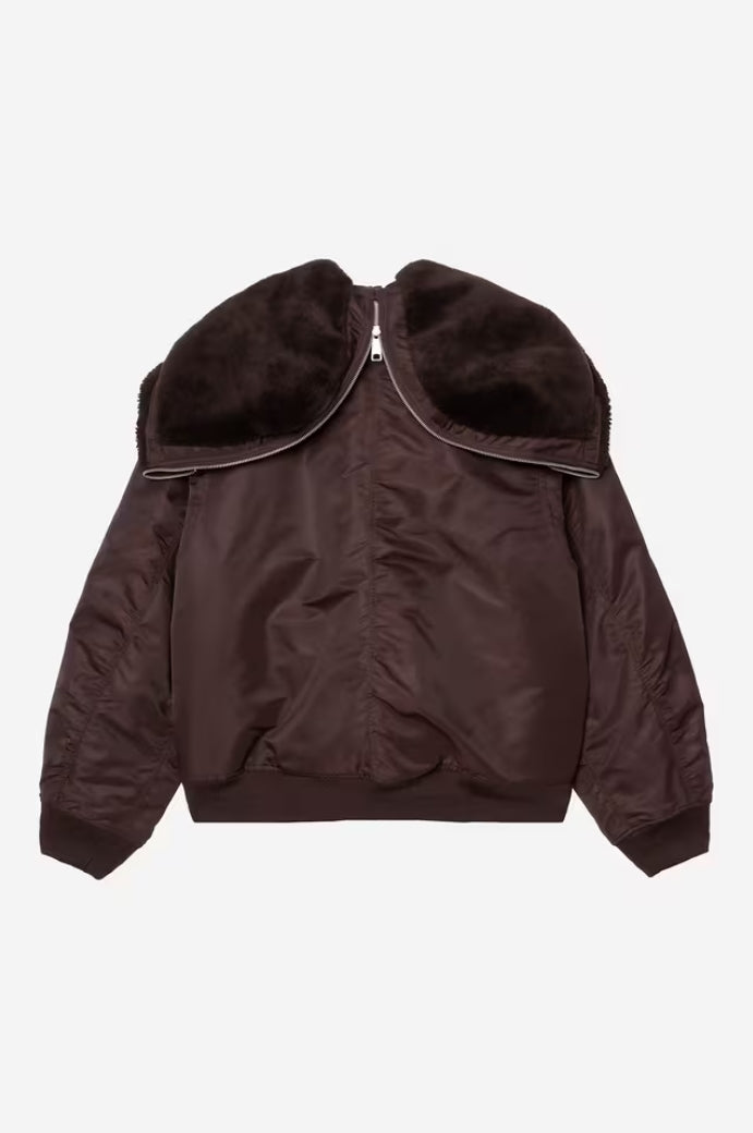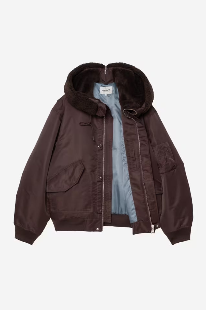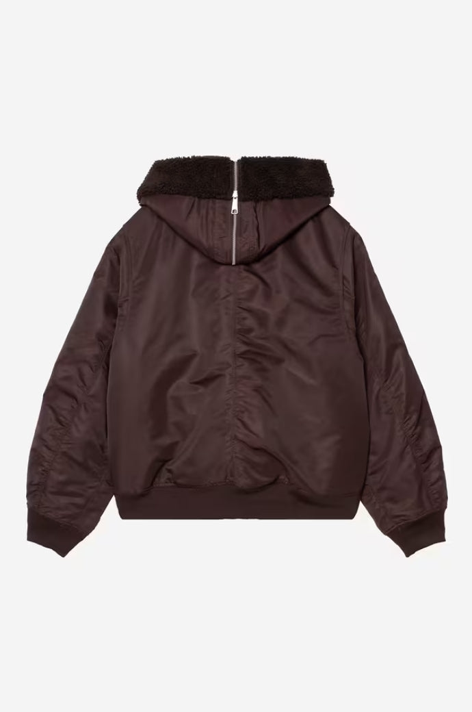 The Hooded Oltera Bomber is made from lined, midweight nylon with water-repellent qualities. It features a large adjustable funnel hood with a zip at the back, and a detachable pile brim at the front. The item has two flap pockets on the front and a zipped pocket on the sleeve. Triple-stitched details offer additional durability at vital stress points. A woven Square Label completes the design.