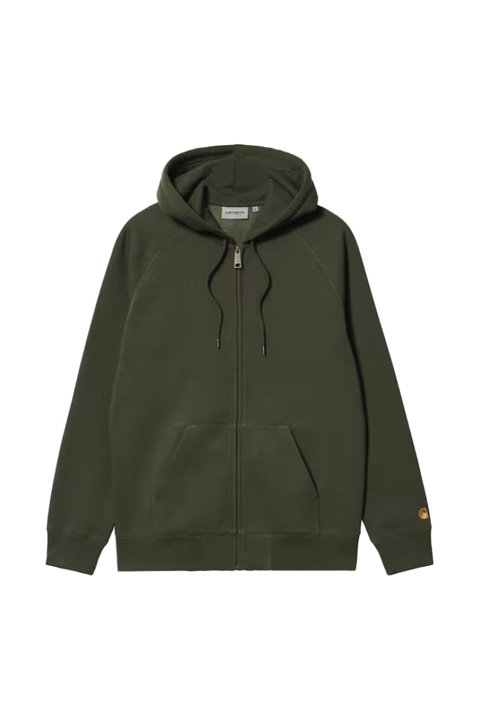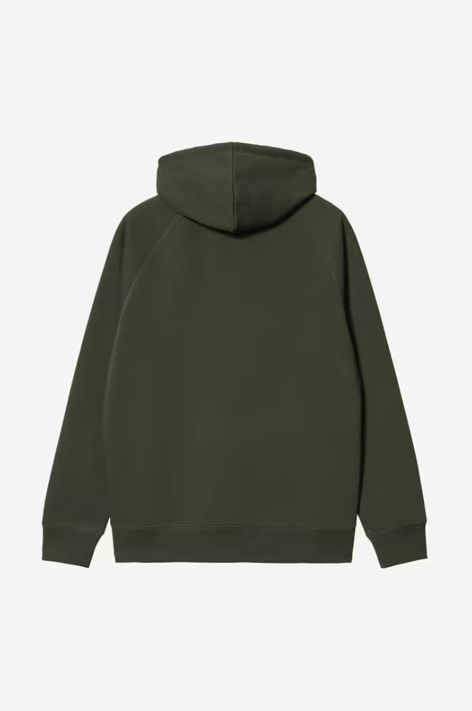 The Hooded Chase Jacket is constructed from heavyweight polycotton jersey in a regular fit. The fabric has also been brushed, giving it a fleece-like backing. The item features raglan sleeves and is detailed with flatlock stitching. An embroidered 'C' Logo appears on the left sleeve.