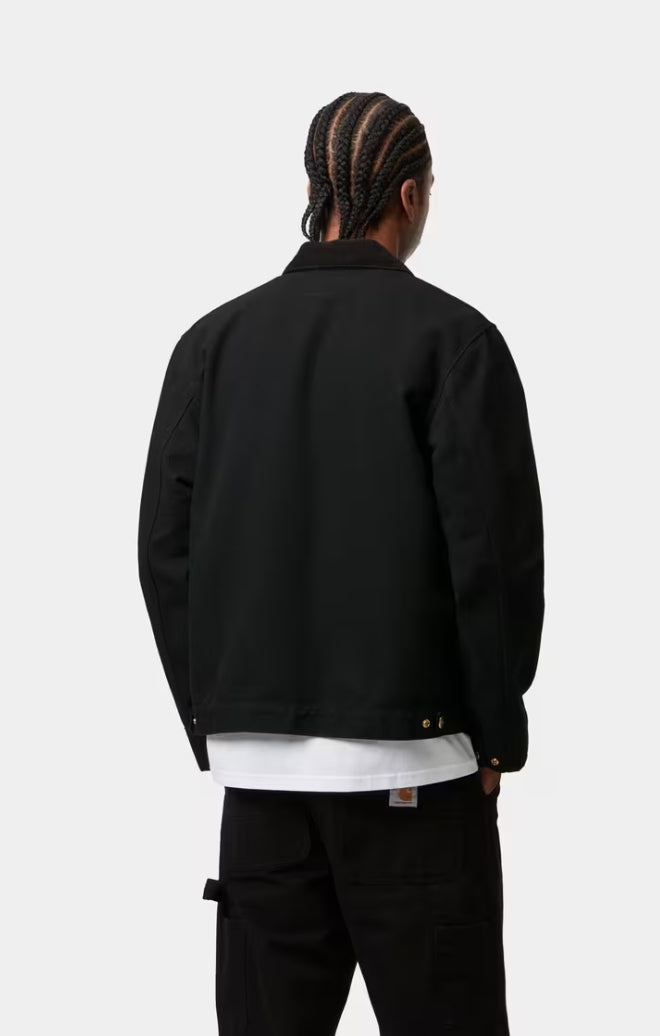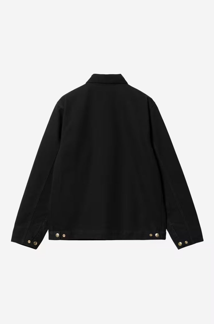 The Detroit Jacket is an unlined style made from heavyweight Dearborn Canvas, featuring a corduroy collar. The jacket fastens with a zip at the front, and can be adjusted at the cuffs and the bottom band with snap buttons. A woven Square Label appears on the chest.