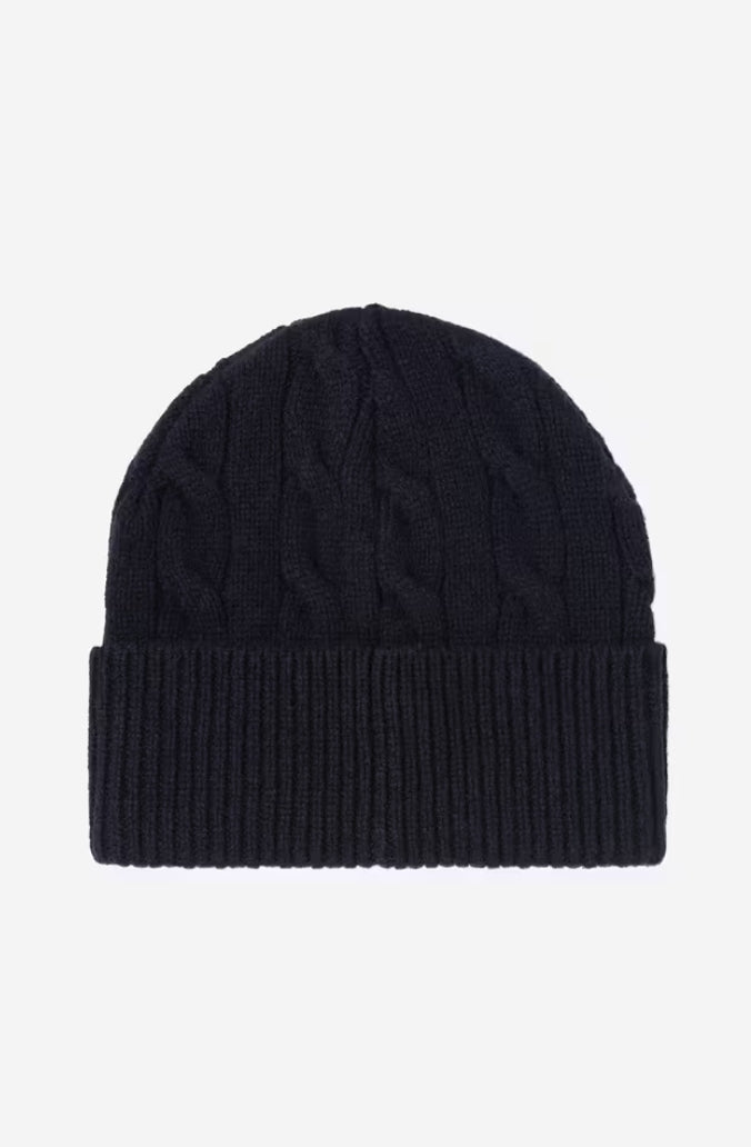 The Signature Cable Beanie is a cable-knit style made from a lambswool and nylon yarn. A graphic logo embroidery appears on the cuff.