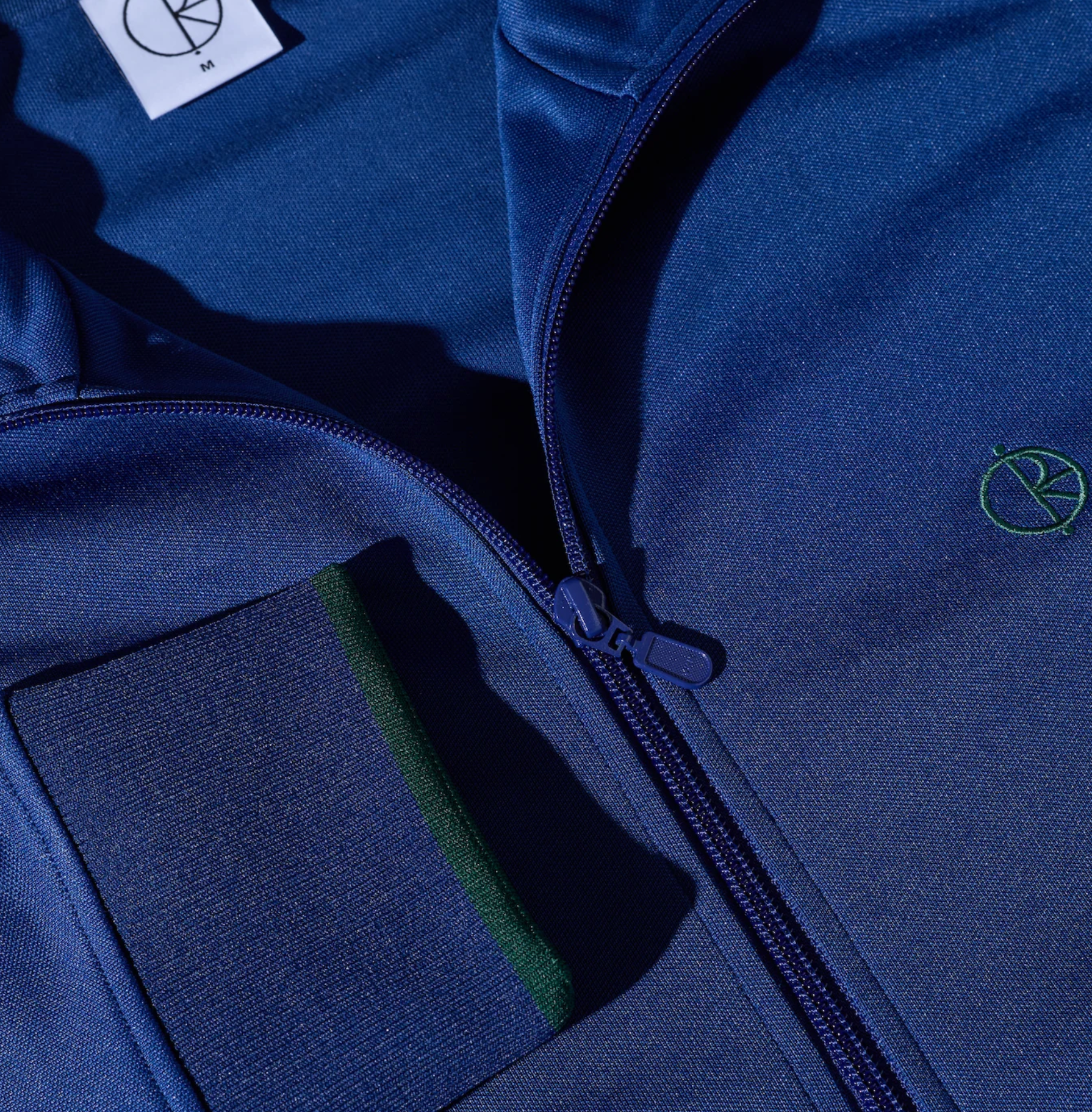 Sweatshirt in ultramarine, crafted from 300 gsm polyester-cotton interlock jacquard. High rib neck with elastic cuffs and waistband for a structured fit. Contrast green piping and YKK zipped pockets. Green stroke logo embroidery, regular fit silhouette.