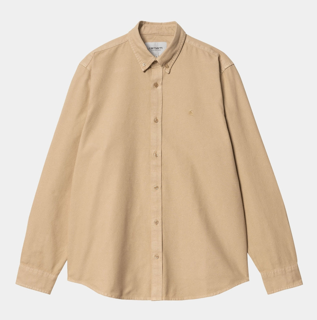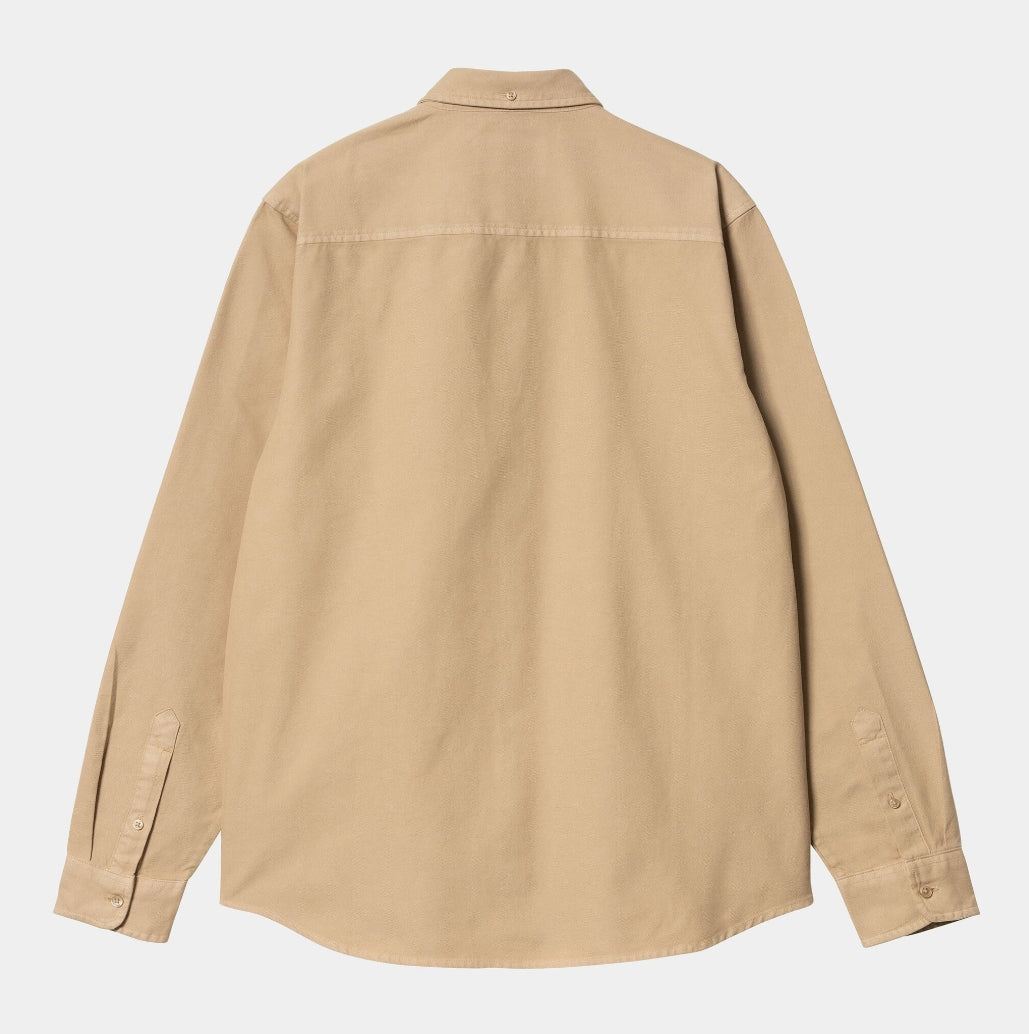 The L/S Bolton Shirt is a classic button-down style and has been woven from Oxford cotton in a regular fit, and features a curved hem. It has been garment-dyed resulting in a subtle variation in color throughout and a softer feel. It is finished with a button-down collar and subtle embroidered Carhartt WIP 'C' Logo at the chest.