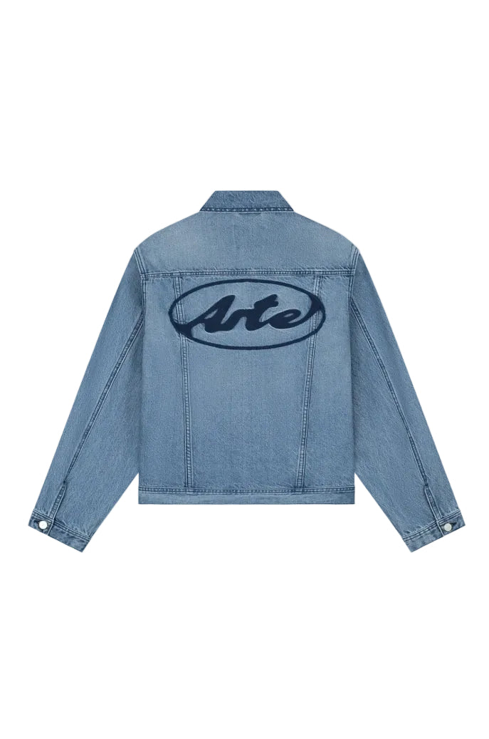 Crafted from premium denim, the jacket features a seasonal Arte logo stitched across the back in navy. Rendered in a washed light blue shade, the jacket is finished with classic chest pockets, two side pockets and a hidden button placket.