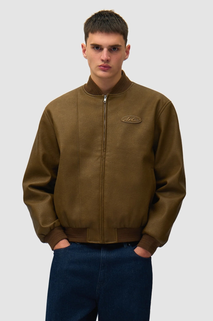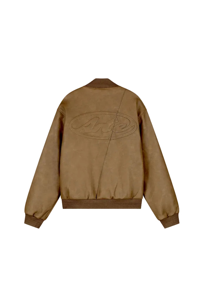 Designed in a faux leather, this brown colored jacket is a statement piece for every season. Channeling the theme of the collection, the jacket features a seasonal Arte logo across the back that is divided by a seam that runs diagonally across the piece. Offering effortless style, the jacket has a zipper closure, two side pockets, elasticated trims and is finished with a tonal cord stitched Arte logo on the left of the chest.